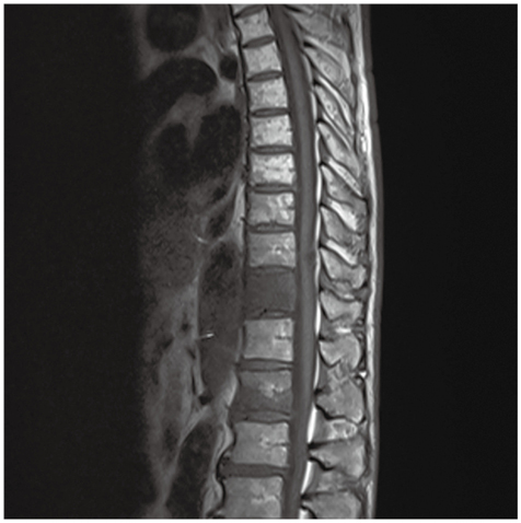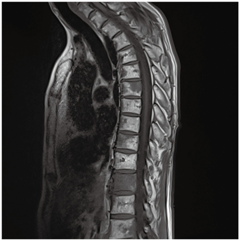 左下葉肺癌,多発リンパ節転移に対して化学療法中。腰痛を自覚し,胸腰椎MRI検査で異常を指摘された。