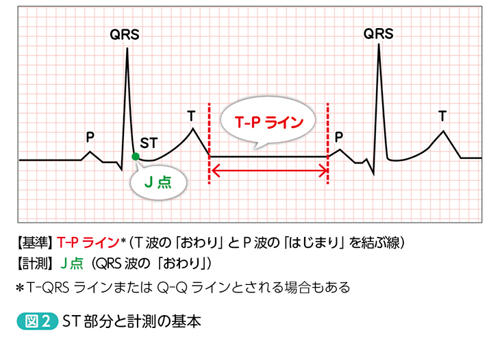 皆さんは,ST部分と聞くと,何を思い浮かべますか? 多くの方は,ST部分の“変化”と虚血性心疾患をリンクさせるのではないでしょうか?…基本はそれでOKです*1。ST部分の大きな意義は,それ単体というよりは,ベースライン(基線)からの変化―すなわち,「ST上昇」と「ST下降」*2にあるわけです。これらをまとめて「ST偏位」と言いますが,基本的な計測法を図2にまとめました。