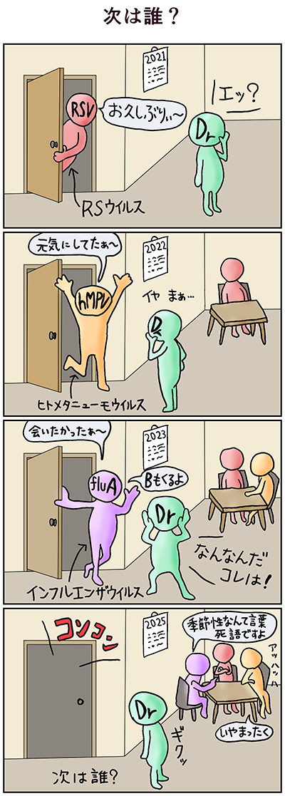 ウイルス流行の季節性は,COVID-19以後に大きく様変わりした。2020年にほとんどのウイルスの流行が一時的に抑制されたが,RSVは2021年より,hMPVは2022年7月,インフルエンザウイルスは2023年以降に流行が再開した3)。また,以前のような季節性流行だけでなく,年間を通じて散発的に流行が続いている状況である。これらの動向から地域の感染症週報などで「いま流行しているウイルス」を確認し,検査や隔離策を柔軟に選択することが求められる。