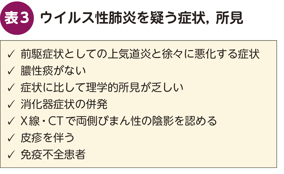 ウイルス性肺炎の診断において,細菌性肺炎と区別するための特徴的な病歴や所見は存在しないが,以下のような場合には,ウイルス性肺炎も鑑別疾患に挙げるべきである(表3)。