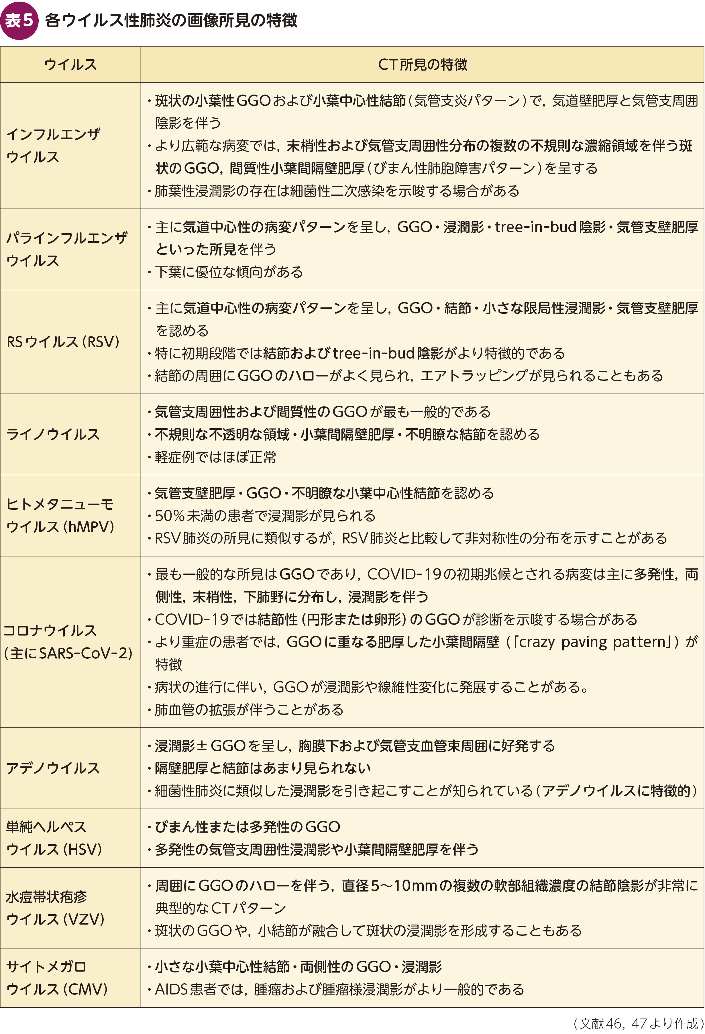 各ウイルス性肺炎の画像所見の特徴について表5にまとめた46)47)。画像所見は宿主側の免疫やフェーズによっても異なるため,必ずしも典型的な陰影とならない。RSVやhMPVのように一見するとウイルス性肺炎に見えないような症例もあり,画像所見のみでウイルス性肺炎“らしさ”を断定することは困難であろう。