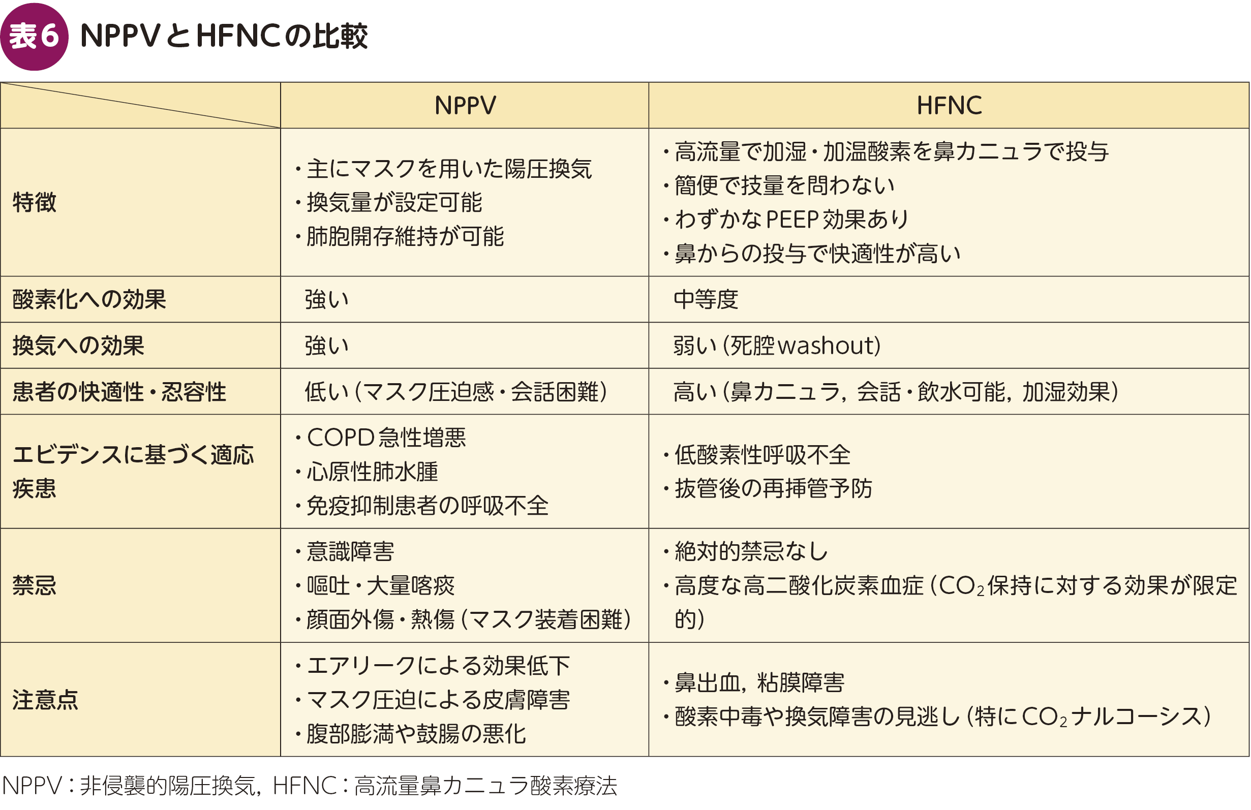 ウイルス性肺炎による急性低酸素性呼吸不全に対してNPPVとHFNCがしばしば用いられる。2つのデバイスの特徴の違いを表6に示す。特にCOVID-19パンデミックを通じてHFNCの使用が広がり,気管挿管を回避できた呼吸不全患者も多い。しかし,たとえばCOVID-19患者を対象とした試験においてNPPVやHFNCは気管挿管を減少させたものの,短期死亡については減少しなかった48)49)。これには気管挿管が必要な患者への挿管のタイミングが遅れてしまったことが影響しているのかもしれない。
