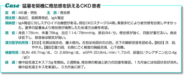 本邦には推定2000万人の慢性腎臓病(chronic kidney disease:CKD)患者が存在し,これは成人の約5人に1人に相当する1)。CKD患者は多彩な愁訴を呈することが多く2),その診療には漢方医学的視点が有用である。本稿では,倦怠感を主訴とするCKD患者に対する補中益気湯の運用を概説する。