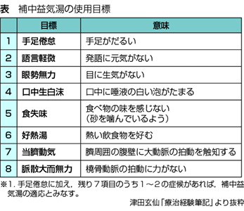 補中益気湯は黄耆と人参を含む参耆剤であり,気の補充が必要な陽証,虚証の症例に適する。CKD診療においても倦怠感に広く活用できる。津田玄仙が記した口訣によれば,四肢のだるさに加え他の1~2症候を伴う場合,補中益気湯の適応が検討される(表)。