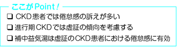 CKD患者は保存期,透析期を問わず倦怠感を訴える頻度が高い3)。西洋医学的治療で不十分な場合,漢方薬は有力な選択肢となる。進行期CKDでは腎性貧血などの併発症とともに,漢方医学的な虚証の傾向が強まり,黄耆を含む補剤の漢方薬が適応となることが多い。