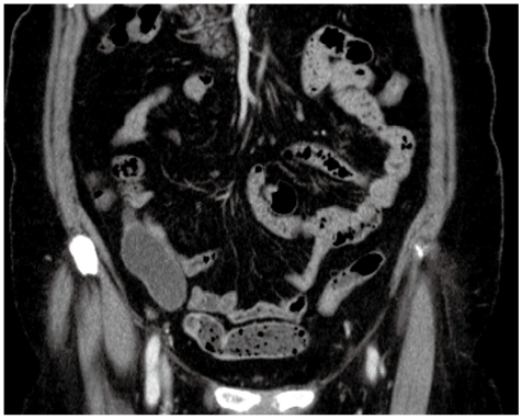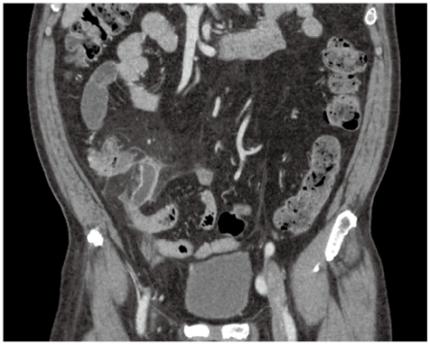 昼頃から右下腹部痛が出現し来院。前日夜から38℃台の発熱あり。WBC 10.9×103/μL,CRP 22.4mg/dL。