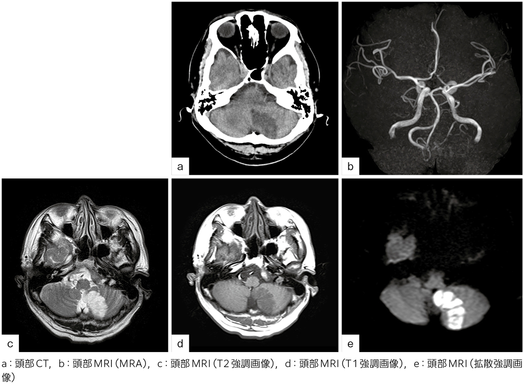 2日前に突然のめまいと強い頭痛を自覚したが,そのまま放置して仕事をしていた。その後,めまいは軽快したものの頭痛は持続し,不安を感じて近くの病院を受診。頭部CT(図a),MRI(図b~e)にて,小脳の異常が指摘され,当院へ紹介された。
