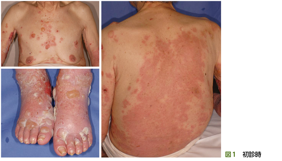 80歳代,女性。半年前から,体幹四肢に大型の緊満性水疱や痒みを伴う紅斑が出現している(図1)。抗アレルギー薬内服とステロイド外用治療を開始したが,増悪してきたため受診した。