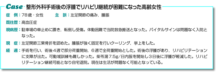 浮腫,腫脹に関する漢方薬は,柴苓湯,治打撲一方,桂枝茯苓丸などがある。骨折術後,捻挫など外傷による腫脹で救急外来などでは治打撲一方が利用されることが多い。当院の臨床成績では,骨折,打撲,捻挫での腫脹があり治打撲一方を内服し改善したのは,男性71%,女性76%であった。疼痛は,NRS(Numerical Rating Scale)10から6に軽減した。
