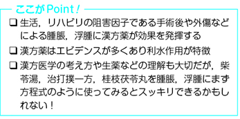 腫脹や浮腫などを改善する西洋薬にはない抗炎症作用と利水作用を含んだ漢方薬の利点を生かしながら,西洋薬や手術後などの困った際の切り札として漢方薬を併用していくことは患者の満足度を高めることにつながる。決して漢方薬単独で攻めるのではなく,治療を進める過程の中での補剤として使用していくと良いと考える。