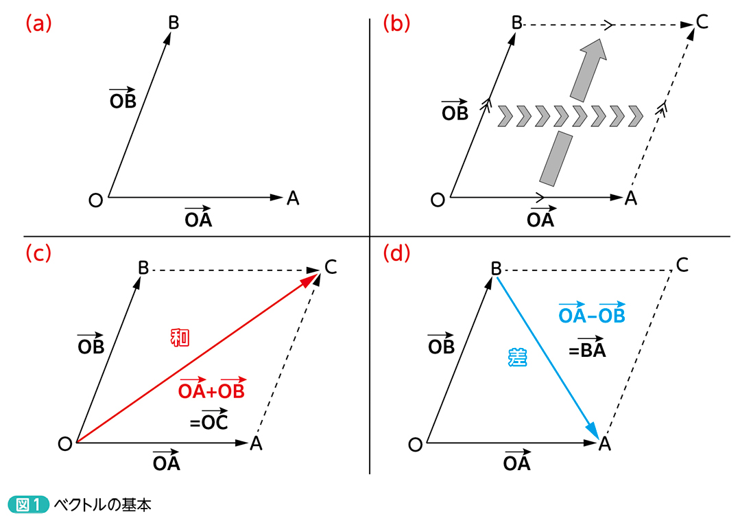 まずは復習から。図1をご覧下さい。3つの点(O,A,B)があり,点Oを始点とする矢印を考えます(a)。点Oから点Aに進む矢印をベクトルOAとし,同様に点Oから点Bに進むベクトルを,OBと定義します。なお,ベクトルに関しては,“文字上に矢印(→)”を乗せた表記が一般的には多く見られますが,今回は誌面の都合により本文内は太字イタリックで示します。この表現でも同様にベクトルを表すと考えて下さい。点Oを原点とすれば,OAはAの“位置(そのもの)”とも言えますし,点Oから点Aに“進む(移動する)”モーションとしてとらえてもOKです。まずはこの考え方を理解しましょう。