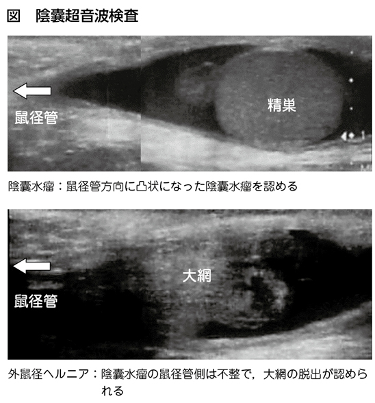 右側に多く(左:右=1:2),比較的軟らかく,透光性のある無痛性腫瘤を陰囊に認める。ジャンプするなど腹圧をかけて,外鼠径ヘルニアの合併がないか確認する。外鼠径ヘルニアが否定できない場合は陰囊超音波検査を行う(図)。