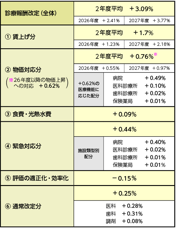 本体改定率の内訳は、①賃上げ分:+1.70%(26年度:+1.23%、27年度:+2.18%)、②物価対応分:+0.76%(26年度:+0.55%、27年度:+0.97%)、③食費・光熱水費分+0.09%、④2024年度診療報酬改定以降の経営環境の悪化を踏まえた緊急対応分+0.44%、⑤後発医薬品体制加算・後発医薬品調剤体制加算など後発品への置換えの進展を踏まえた処方や調剤についての評価の適正化や、在宅医療・訪問看護関係の評価の適正化、長期処方・リフィル処方の取り組み強化などによる効率化:-0.15%─となっている。