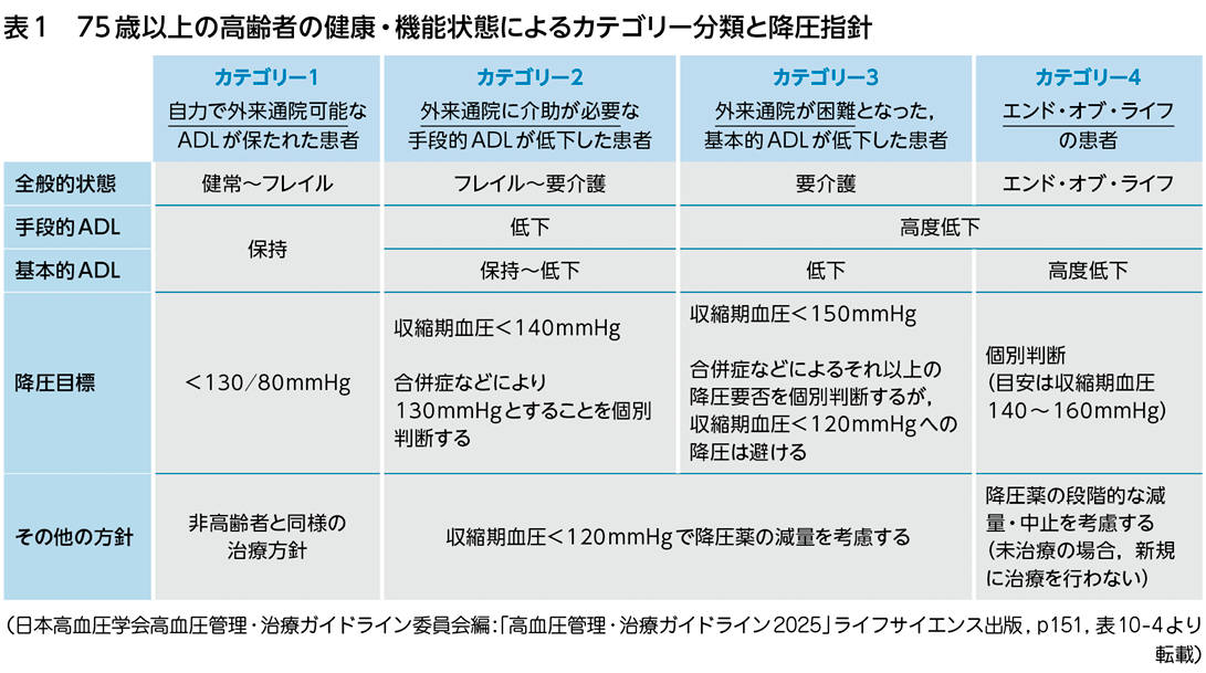 【石川】GL2019までは高齢者の降圧目標をフレイルのあるなしでわけており,独歩で通院困難な患者では目標値を個別的に判断するとしていました。しかし,GL2025ではもう少し具体的に,フレイル,要介護,エンド・オブ・ライフといった全般的状況に応じて,75歳以上の高齢者の降圧指針を示したのが新しい点だと思います。