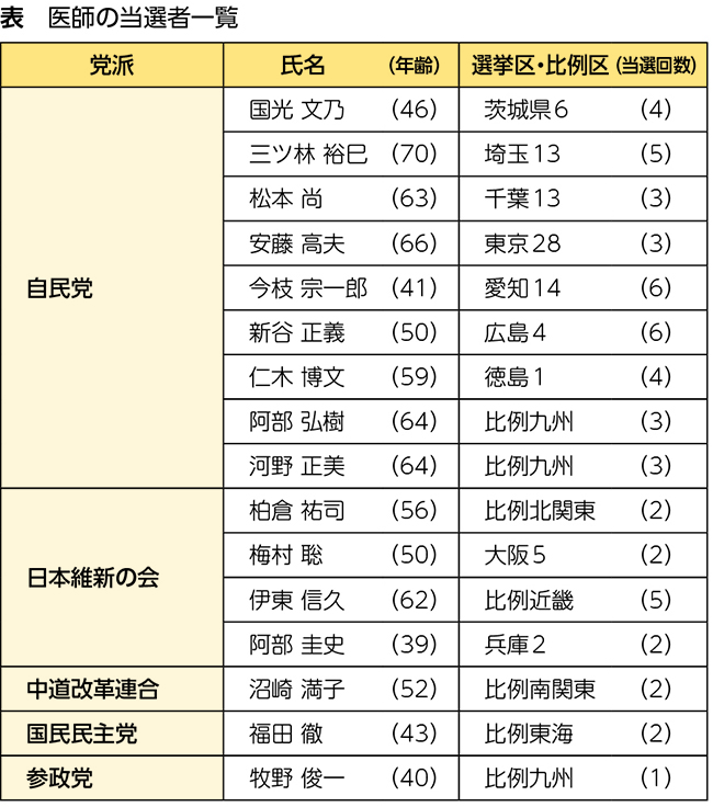 日本医事新報の調べで医師資格を持つ当選者は、自民党9人、維新の会4人、中道改革連合1人、国民民主党1人、参政党1人の計16人(表)。自民から出馬した医師は全員当選した。