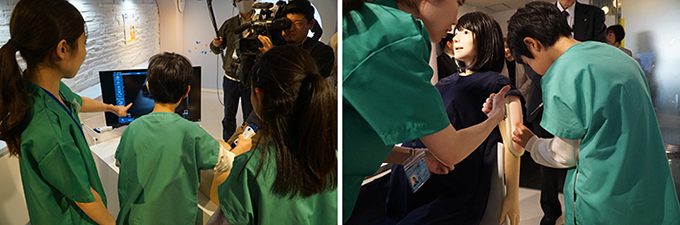 超音波検査では、実際に医療用人体モデルにエコープローブを当て、胎児の頭位や心臓、四肢などを確認。予防接種では医師役の児童が問診を行った上で、薬剤の代わりに水を入れた注射器を使い、医療用人体モデルに筋肉注射を行った。