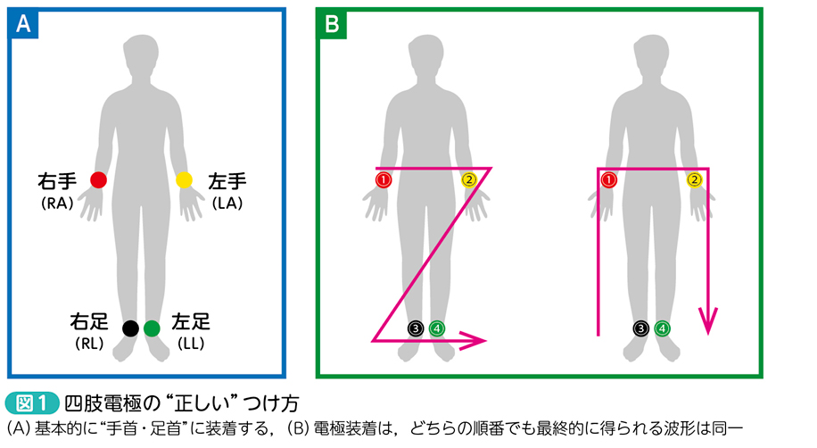 四肢は“手足”という意味ですから,左右(L/R)×手足(A/L)の計4箇所に電極をつけましょう。電極カラーは“世界共通”で,正しいつけ方は,右手(RA):赤(●),左手(LA):黄(●),右足(RL):黒(●),左足(LL):緑(●)です(図1A)。